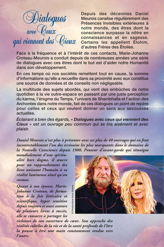 Depuis des décennies Daniel Meurois canalise régulièrement des Présences Invisibles extérieures à notre monde, des êtres dont la conscience surpasse la nôtre en connaissances et en sagesse. Certains les appellent Élohim, d’autres Frères des Étoiles. Face à la fréquence et à l’intérêt de ces contacts, Marie-Johanne Croteau-Meurois a conduit depuis des années une série de dialogues avec ces êtres dont le but est d’aider notre humanité dans son développement. En ces temps où nos sociétés remettent tout en cause, la somme d’informations qu’elle a recueillie dans sa proximité avec eux constitue une source de données et de conseils non négligeable. La multitude des sujets abordés, qui vont des embûches de notre quotidien à la vie outre-espace en passant par une juste perception du karma, l’énigme du Temps, l’univers de Shambhalla et l’action des Archontes dans notre monde, fait de ces dialogues un point de repère pour celles et ceux qui veulent donner un sens aux secousses actuelles. Éclairant à bien des égards, ¨Dialogues avec ceux qui viennent des Cieux¨ est un ouvrage peu commun qui se lira aisément et avec plaisir.