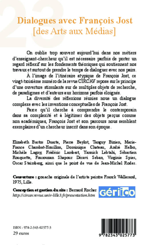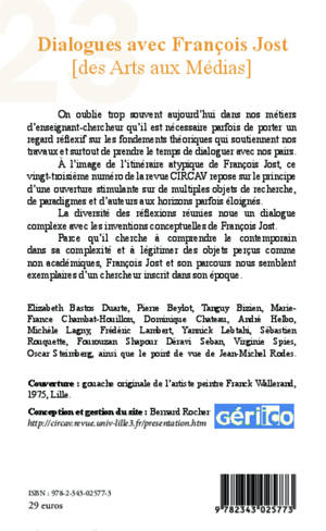 À l’image de l’itinéraire atypique de François Jost, ce vingt-troisième numéro de la revue CIRCAV repose sur le principe d’une ouverture stimulante sur de multiples objets de recherche, de paradigmes et d’auteurs aux horizons parfois éloignés. La diversité des réflexions réunies noue un dialogue complexe avec les inventions conceptuelles de François Jost.