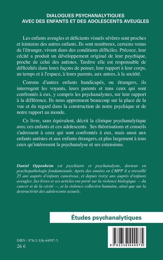 Les enfants aveugles et déficients visuels sévères sont proches et lointains des autres enfants. Ils sont nombreux, certains venus de l'étranger, vivant dans des conditions difficiles. Précoce, leur cécité a produit un développement original de leur psychique, proche de celui des autistes. Tardive elle est responsable de difficultés dans leurs façons de penser, leur rapport à leur corps, au temps et à l'espace, à leurs parents, aux autres, à la société. Comme d'autres enfants handicapés, ou étrangers, ils interrogent les voyants, leurs parents et tous ceux qui sont confrontés à eux, y compris les psychanalystes, sur leur rapport à la différence. Ils nous apprennent beaucoup sur la place de la vue et du regard dans la construction de notre psychique et de notre rapport au monde. Ce livre, sans équivalent, décrit la clinique psychanalytique avec ces enfants et ces adolescents. Ses théorisations et conseils s'adressent à ceux qui sont confrontés à eux, mais aussi aux enfants autistes et aux enfants étrangers, et plus largement à tous ceux qu'intéressent la psychanalyse et ses extensions.