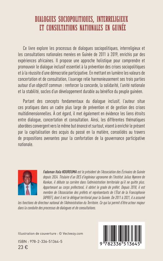 Ce livre explore les processus de dialogue sociopolitique, interreligieux et les consultations nationales menées en Guinée de 2011 à 2019, enrichis par des expériences africaines. Il propose une approche holistique pour comprendre et promouvoir le dialogue inclusif essentiel à la prévention des crises sociopolitiques et à la réussite d'une démocratie participative. En mettant en lumière les valeurs de concertation et de consultation, l'ouvrage relie harmonieusement ses trois parties autour d'un objectif commun: renforcer la concorde, la solidarité, l'unité nationale et la stabilité, socles d'un développement durable au bénéfice du peuple guinéen. Partant des concepts fondamentaux du dialogue inclusif, l'auteur situe ces pratiques dans un cadre plus large de prévention et de gestion des crises multidimensionnelles. À cet égard, il met également en évidence les liens étroits entre dialogue, concertation et consultation. Ainsi, les différentes thématiques abordées convergent vers le même but énoncé et surtout, visent à enrichir le présent par la capitalisation des acquis du passé en la matière, consolidés au travers de propositions avenantes pour la confortation de la gouvernance participative nationale.
