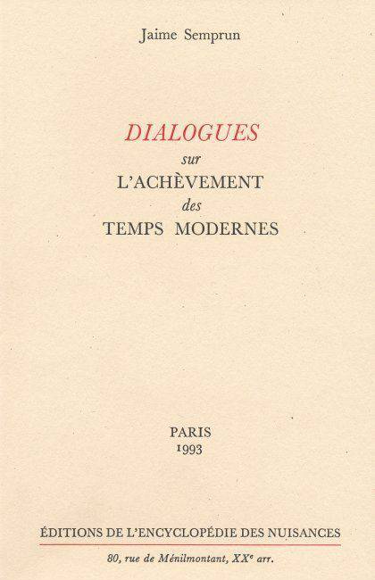 Utilisant les mêmes procédés que Brecht dans "Dialogues d'exilés", l'auteur retrace l'évolution des Temps Modernes qui avaient commencé avec les villes et s'achèvent avec elles.