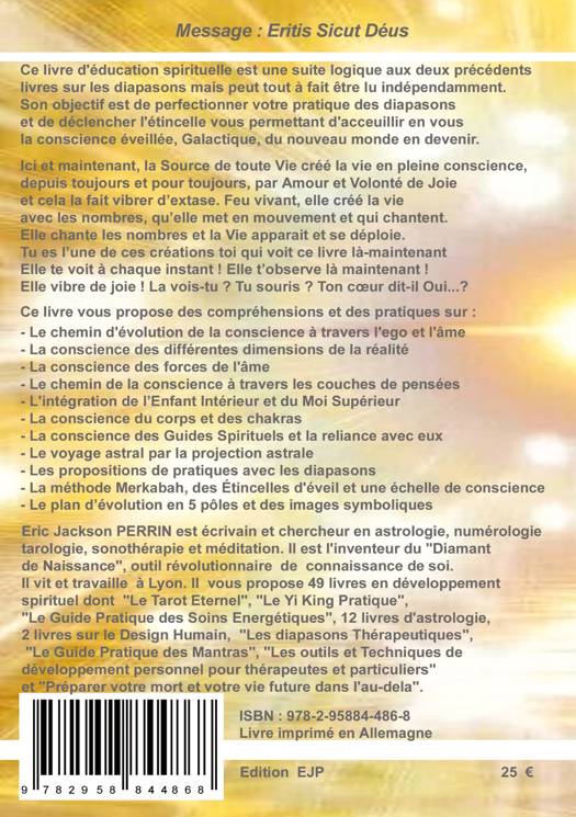 Bonjour, ce livre d'éducation spirituelle est une suite logique aux deux précédents livres sur les diapasons mais peut tout à fait être lu indépendamment. Son objectif est de perfectionner votre pratique des diapasons et de déclencher l'étincelle vous permanent d'acceuillir en vous la conscience éveillée, Galactique, du nouveau monde en devenir. Ici et maintenant, la Source de toute Vie créé la vie partout en pleine conscience depuis toujours et pour toujours, par Amour et Volonté de Joie et cela la fait vibrer d'extase. Feu vivant, elle créé la vie avec les nombres, qu'elle met en mouvement et qui chantent. Elle chante les nombres et la vie apparait et se déploie.