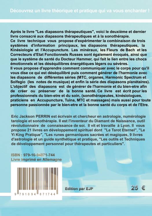 Ce livre fait suite au livre les diapasons thérapeutiques, qui permettent d'acquérir des bases en sonothérapie avec les diapasons. C'est un livre de recherche et de pratique. Il vous propose d'acquérir des bases solides en Kinésiologie et en Acupuncture Traditionnelle Chinoise, puis avec ses deux disciplines comme fondation, de générer du bien-être avec les diapasons thérapeutiques.