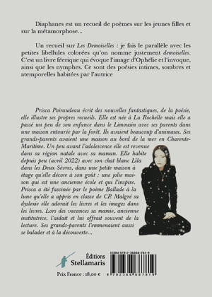 Un recueil sur Les Demoiselles : je fais le parallèle avec les petites libellules colorées qu’on nomment justement demoiselles. C’est un livre féerique qui évoque l’image d’Ophélie et l’invoque, ainsi que les nymphes. Ce sont des poésies intimes, sombres et atemporelles habitées par l’autrice