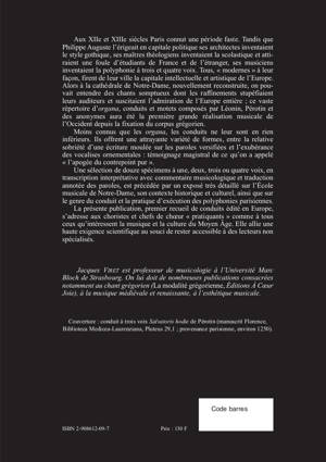 Aux XIIe et XIIIe siècles Paris connut une période faste. Tandis que Philippe Auguste l’érigeait en capitale politique ses architectes inventaient le style gothique, ses maîtres théologiens inventaient la scolastique et attiraient une foule d’étudiants de France et de l’étranger, ses musiciens inventaient la polyphonie à trois et quatre voix. Tous, « modernes » à leur façon, firent de leur ville la capitale intellectuelle et artistique de l’Europe. Alors à la cathédrale de Notre-Dame, nouvellement reconstruite, on pouvait entendre des chants somptueux dont les raffinements stupéfiaient leurs auditeurs et suscitaient l’admiration de l’Europe entière ; ce vaste répertoire d’organa, conduits et motets composés par Léonin, Pérotin et des anonymes aura été la première grande réalisation musicale de l’Occident depuis la fixation du corpus grégorien. Moins connus que les organa, les conduits ne leur sont en rien inférieurs. Ils offrent une attrayante variété de formes, entre la relative sobriété d’une écriture moulée sur les paroles versifiées et l’exubérance des vocalises ornementales : témoignage magistral de ce qu’on a appelé « l’apogée du contrepoint pur ». Une sélection de douze spécimens à une, deux, trois ou quatre voix, en transcription interprétative avec commentaire musicologique et traduction annotée des paroles, est précédée par un exposé très détaillé sur l’École musicale de Notre-Dame, son contexte historique et culturel, ainsi que sur le genre du conduit et la pratique d’exécution des polyphonies parisiennes. La présente publication, premier recueil de conduits édité en Europe, s’adresse aux choristes et chefs de choeur « pratiquants » comme à tous ceux qu’intéressent la musique et la culture du Moyen Âge. Elle allie une haute exigence scientifique au souci de rester accessible à des lecteurs non spécialisés.