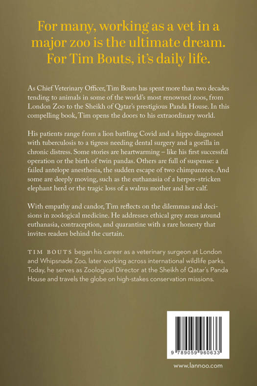 Immerse yourself in the world of a passionate veterinarian, and discover the fascinating behind-the-scenes of a zoo. Working as a vet in a large zoo is a dream job for many--but for Tim Bouts, it's reality. As Chief Veterinary Officer, he has spent over 20 years caring for animals in world-renowned parks like London Zoo. Today, he works at the Sheikh of Qatar's 'Panda House.' In this book, he shares remarkable stories from his diverse range of patients: a lion battling Covid, a hippopotamus with tuberculosis, a tigress with dental issues, and a gorilla suffering from chronic pain. Some of his anecdotes are heartwarming, like his first successful surgery, or welcoming baby pandas to Pairi Daiza in Belgium. Others are pulse-pounding, such as the failed anesthesia of an antelope, and the escape of two chimpanzees. And some are deeply moving, like the euthanasia of a herd of herpes-stricken elephants or the heartbreaking loss of a walrus mother and her calf. Through these stories, you'll get a front-row seat to Tim's daily work and a rare glimpse into his thoughts. He doesn't shy away from sensitive topics like euthanasia, contraception in zoos, and the challenges of quarantining animals.