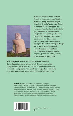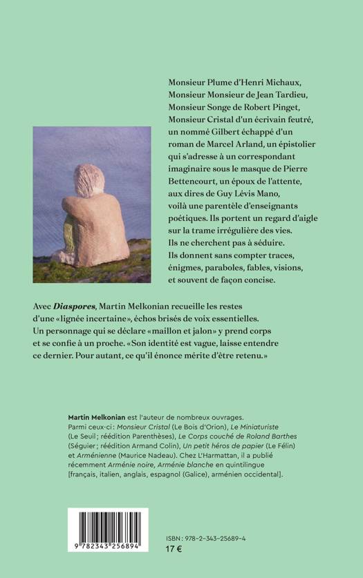 Monsieur Plume d’Henri Michaux, Monsieur Monsieur de Jean Tardieu, Monsieur Songe de Robert Pinget, Monsieur Cristal d’un écrivain feutré, un nommé Gilbert échappé d’un roman de Marcel Arland, un épistolier qui s’adresse à un correspondant imaginaire sous le masque de Pierre Bettencourt, un époux de l’attente, aux dires de Guy Lévis Mano, voilà une parentèle d’enseignants poétiques. Ils portent un regard d’aigle sur la trame irrégulière des vies. Ils ne cherchent pas à séduire. Ils donnent sans compter traces, énigmes, paraboles, fables, visions, et souvent de façon concise. Avec Diaspores, Martin Melkonian recueille les restes d’une «lignée incertaine», échos brisés de voix essentielles. Un personnage qui se déclare «maillon et jalon» y prend corps et se confie à un proche. «Son identité est vague, laisse entendre ce dernier. Pour autant, ce qu’il énonce mérite d’être retenu.»