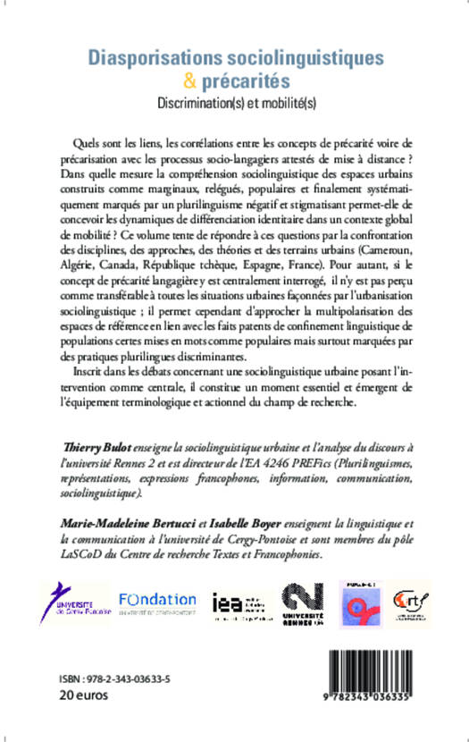 Quels sont les liens, les corrélations entre les concepts de précarité voire de précarisation avec les processus socio-langagiers attestés de mise à distance ? Dans quelle mesure la compréhension sociolinguistique des espaces urbains construits comme marginaux, relégués, populaires et finalement systématiquement marqués par un plurilinguisme négatif et stigmatisant permet-elle de concevoir les dynamiques de différenciation identitaire ? Cette étude s'appuie sur des terrains multiples : Cameroun, Algérie, Canada, République tchèque, Espagne, France.