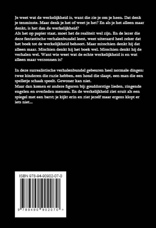 Je weet wat de werkelijkheid is, want die zie je om je heen. Dat denk je tenminste. Maar denk je het of weet je het? En als je het alleen maar denkt, is het dan de werkelijkheid? Als het op papier staat, moet het de realiteit wel zijn. En de lezer die deze fantastische verhalenbundel leest, weet uiteraard heel zeker dat het boek tot de werkelijkheid behoort. Maar misschien denkt hij dat alleen maar. Mischien denkt hij het boek wel. Misschien denkt hij de verhalen wel. Want wie weet wat de echte werkelijkheid is en wat alleen maar verzonnen is? In deze surrealistische verhalenbundel gebeuren heel normale dingen: twee kinderen die ruzie hebben, een hond die slaapt, een man die een spelletje schaak speelt. Gewoner kan niet. Maar dan komen er andere figuren bij: gouddorstige lieden, zingende engelen en overleden mensen. En de werkelijkheid ziet eruit als een spiegel met een barst; je kijkt erin en ziet jezelf maar ergens klopt er iets niet...