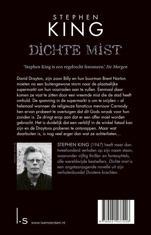 Dichte mist, een ijzingwekkend spannende novelle van internationaal bestsellerauteur Stephen King, is succesvol verfilmd als The Mist met Thomas Jane en Marcia Gay Harden in de hoofdrol.