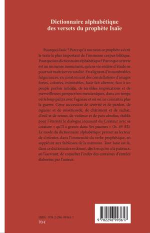 Pourquoi Isaïe ? Parce qu'à nos yeux ce prophète a écrit le texte le plus important de l'immense corpus biblique. Pourquoi un dictionnaire alphabétique ? Parce que ce texte est un immense monument, qu'une vie entière d'étude ne pourrait maîtriser en totalité. Le mode du dictionnaire alphabétique permet au lecteur de s'orienter, dans l'immensité du verbe prophétique, en suppléant aux faiblesses de la mémoire. Ce dictionnaire ordonné comporte un index d'une centaine d'entrées élaborées par l'auteur.