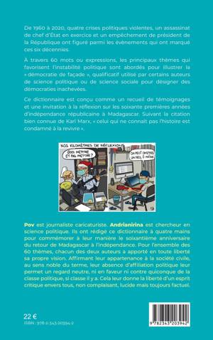 De 1960 à 2020, quatre crises politiques violentes, un assassinat de chef d’État en exercice et un empêchement de président de la République ont figuré parmi les évènements qui ont marqué ces six décennies. À travers 60 mots ou expressions, les principaux thèmes qui favorisent l’instabilité politique sont abordés pour illustrer la « démocratie de façade », qualificatif utilisé par certains auteurs de science politique ou de science sociale pour désigner des démocraties inachevées. Ce dictionnaire est conçu comme un recueil de témoignages et une invitation à la réflexion sur les soixante premières années d’indépendance républicaine à Madagascar. Suivant la citation bien connue de Karl Marx, « celui qui ne connaît pas l’histoire est condamné à la revivre »