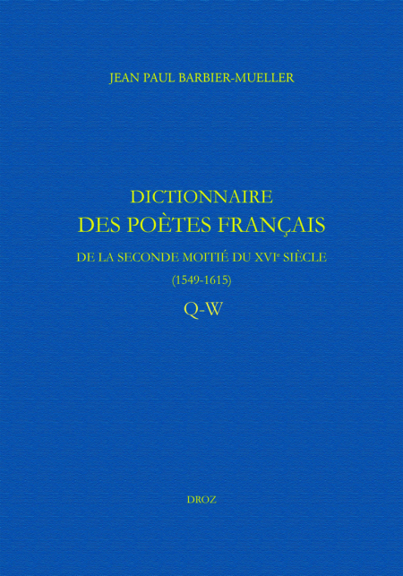 Pendant soixante-dix ans, Jean Paul Barbier-Mueller a aimé la poésie et les livres. En quarante ans, il a publié le catalogue de la plus importante collection de livres de poésie de la Renaissance jamais constituée, Ma bibliothèque poétique. Ce catalogue est devenu un usuel dans de très nombreuses bibliothèques. Aux descriptions bibliographiques précises, Jean Paul Barbier-Mueller a toujours ajouté des éléments biographiques et historiques à ses notices, et il a souhaité développer dans un dictionnaire une masse de renseignements tirés de documents rares, de pièces liminaires, d’épîtres dédicatoires... Avec le concours de Nicolas Ducimetière et de Marine Molins, il a donc rédigé un Dictionnaire des poètes français de la seconde moitié du XVIe siècle, qui comptera près de cinq mille pages en six volumes. Il a ainsi sorti de l’ombre un grand nombre de poètes peu connus du XVIe siècle, plus de cinq cents, tout en donnant une quarantaine de grandes notices sur des poètes majeurs. Sa contribution sur Louise Labé, remarquable, nourrie de toute la recherche contemporaine et livrant une interprétation personnelle, risque de s’imposer parmi les seiziémistes. Chaque auteur est replacé dans le contexte historique de sa vie d’adulte et de sa région (situation politique, guerres de religion, etc.). Des généalogies et des notes biographiques de personnages influents, français et étrangers, ou de chefs militaires, chantés par « ses » poètes, sont données. Il s’agit du complément naturel et indispensable à Ma bibliothèque poétique.