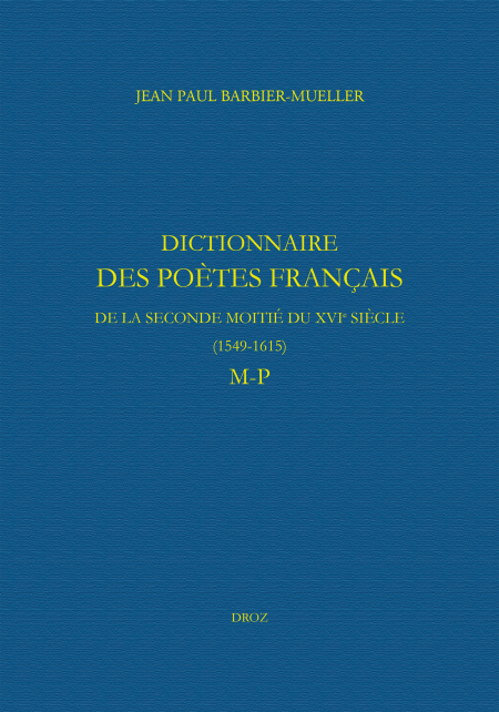 Pendant soixante-dix ans, Jean Paul Barbier-Mueller a aimé la poésie et les livres. En quarante ans, il a publié le catalogue de la plus importante collection de livres de poésie de la Renaissance jamais constituée, Ma bibliothèque poétique. Ce catalogue est devenu un usuel dans de très nombreuses bibliothèques. Aux descriptions bibliographiques précises, Jean Paul Barbier-Mueller a toujours ajouté des éléments biographiques et historiques à ses notices, et il a souhaité développer dans un dictionnaire une masse de renseignements tirés de documents rares, de pièces liminaires, d’épîtres dédicatoires... Avec le concours de Nicolas Ducimetière et de Marine Molins, il a donc rédigé un Dictionnaire des poètes français de la seconde moitié du XVIe siècle, qui comptera près de cinq mille pages en six volumes. Il a ainsi sorti de l’ombre un grand nombre de poètes peu connus du XVIe siècle, plus de cinq cents, tout en donnant une quarantaine de grandes notices sur des poètes majeurs. Sa contribution sur Louise Labé, remarquable, nourrie de toute la recherche contemporaine et livrant une interprétation personnelle, risque de s’imposer parmi les seiziémistes. Chaque auteur est replacé dans le contexte historique de sa vie d’adulte et de sa région (situation politique, guerres de religion, etc.). Des généalogies et des notes biographiques de personnages influents, français et étrangers, ou de chefs militaires, chantés par « ses » poètes, sont données. Il s’agit du complément naturel et indispensable à Ma bibliothèque poétique.