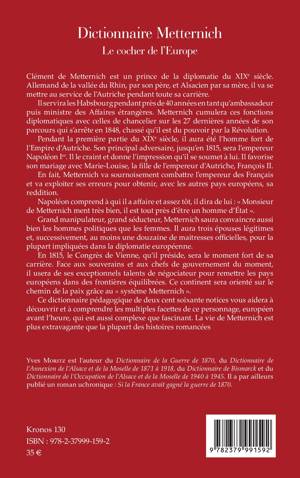 Clément de Metternich est un prince de la diplomatie du XIXe siècle. Allemand de la vallée du Rhin, par son père, et Alsacien par sa mère, il va se mettre au service de l'Autriche pendant toute sa carrière. Il servira les Habsbourg pendant près de 40 années en tant qu'ambassadeur puis ministre des Affaires étrangères. Metternich cumulera ces fonctions diplomatiques avec celles de chancelier sur les 27 dernières années de son parcours qui s'arrête en 1848, chassé qu'il est du pouvoir par la Révolution. Pendant la première partie du XIXe siècle, il aura été l'homme fort de l'Empire d'Autriche. Son principal adversaire, jusqu'en 1815, sera l'empereur Napoléon Ier. Il le craint et donne l'impression qu'il se soumet à lui. Il favorise son mariage avec Marie-Louise, la fille de l'empereur d'Autriche, François II. En fait, Metternich va sournoisement combattre l'empereur des Français et va exploiter ses erreurs pour obtenir, avec les autres pays européens, sa reddition. Napoléon comprend à qui il a affaire et assez tôt, il dira de lui: Monsieur de Metternich ment très bien, il est tout près d'être un homme d'État . Grand manipulateur, grand séducteur, Metternich saura convaincre aussi bien les hommes politiques que les femmes. Il aura trois épouses légitimes et, successivement, au moins une douzaine de maitresses officielles, pour la plupart impliquées dans la diplomatie européenne. En 1815, le Congrès de Vienne, qu'il préside, sera le moment fort de sa carrière. Face aux souverains et aux chefs de gouvernement du moment, il usera de ses exceptionnels talents de négociateur pour remettre les pays européens dans des frontières équilibrées. Ce continent sera orienté sur le chemin de la paix grâce au système Metternich . Ce dictionnaire pédagogique de deux cent soixante notices vous aidera à découvrir et à comprendre les multiples facettes de ce personnage, européen avant l'heure, qui est aussi complexe que fascinant. La vie de Metternich est plus extravagante que la plupart des histoires romancées