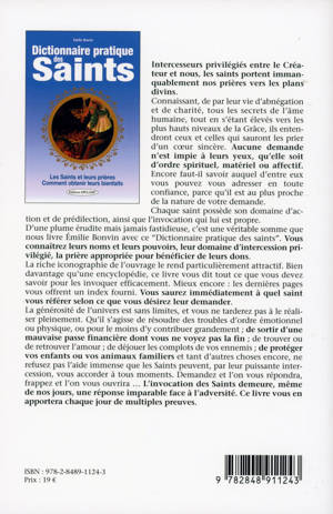 Chaque saint possède son domaine d'action et de prédilection, ainsi que l'invocation qui lui est propre. D'une plume érudite mais jamais fastidieuse, c'est une véritable somme que nous livre Emilie Bonvin avec ce "Dictionnaire pratique des saints". Vous connaîtrez leurs noms et leurs pouvoirs, leur domaine d'intercession privilégié, la prière appropriée pour bénéficier de leurs dons. La riche iconographie de l'ouvrage le rend particulièrement attractif. Bien davantage qu'une encyclopédie, ce livre vous dit tout ce que vous devez savoir pour les invoquer efficacement. Mieux encore : les dernières pages vous offrent un index fourni. Vous saurez immédiatement à quel saint vous référer selon ce que vous désirez leur demander. La générosité de l'univers est sans limites, et vous ne tarderez pas à le réaliser pleinement. Qu'il s'agisse de résoudre des troubles d'ordre émotionnel ou physique, ou pour le moins d'y contribuer grandement ; de sortir d'une mauvaise passe financière dont vous ne voyez pas la fin ; de trouver ou de retrouver l'amour ; de déjouer les complots de vos ennemis ; de protéger vos enfants ou vos animaux familiers et tant d'autres choses encore, ne refusez pas l'aide immense que les Saints peuvent, par leur puissante intercession, vous accorder à tous moments. Demandez et l'on vous répondra, frappez et l'on vous ouvrira ... L'invocation des Saints demeure, même de nos jours, une réponse imparable face à l'adversité. Ce livre vous en apportera chaque jour de multiples preuves.