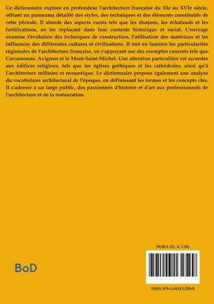 Ce dictionnaire explore en profondeur l'architecture française du XIe au XVIe siècle, offrant un panorama détaillé des styles, des techniques et des éléments constitutifs de cette période. Il aborde des aspects variés tels que les donjons, les échafauds et les fortifications, en les replaçant dans leur contexte historique et social. L'ouvrage examine l'évolution des techniques de construction, l'utilisation des matériaux et les influences des différentes cultures et civilisations. Il met en lumière les particularités régionales de l'architecture française, en s'appuyant sur des exemples concrets tels que Carcassonne, Avignon et le Mont-Saint-Michel. Une attention particulière est accordée aux édifices religieux, tels que les églises gothiques et les cathédrales, ainsi qu'à l'architecture militaire et monastique. Le dictionnaire propose également une analyse du vocabulaire architectural de l'époque, en définissant les termes et les concepts clés. Il s'adresse à un large public, des passionnés d'histoire et d'art aux professionnels de l'architecture et de la restauration.
