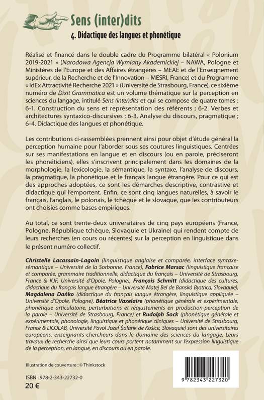 Réalisé et financé dans le double cadre du Programme bilatéral « Polonium 2019-2021 » et du Programme « IdEx Attractivité Recherche 2021» (Université de Strasbourg, France), ce sixième numéro de Dixit Grammatica est un volume thématique sur la perception en sciences du langage, intitulé Sens (inter)dits et qui se compose de quatre tomes : 6-1. Construction du sens et représentation des référents ; 6-2. Verbes et architectures syntaxico-discursives ; 6-3. Analyse du discours, pragmatique ; 6-4. Didactique des langues et phonétique.