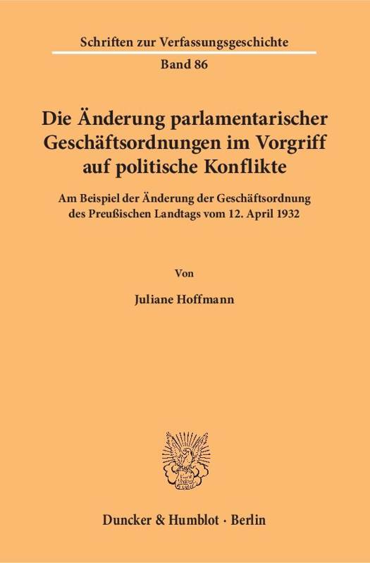 English summary: The Amendment of the Parliament's Rules in Advance of Political Conflicts The thesis deals with the spectacular amendment of the parliamentary rules in Prussia 1932 when - shortly before the end of the legislature - the rule for the election of the Prime Minister was changed so that the NSDAP could not appoint the Prime Minister after the elections. The author analyses the positions represented in literature and places them in the constitutional context. For the first time, the files of the State Court are analysed and evaluated. German description: Parlamentarische Geschaftsordnungen werden in der Rechtswissenschaft oft vernachlassigt, obwohl uber den Weg der Geschaftsordnungsanderung haufig politische Machtfragen entschieden werden. Ein spektakularer Fall der Geschaftsordnungsanderung ereignete sich 1932 in Preussen als - kurz vor Ende der Wahlperiode - die Bestimmung zur Wahl des Ministerprasidenten geandert wurde, so dass die NSDAP nach der Landtagswahl nicht den Ministerprasidenten stellen konnte. Die Vorgreiflichkeit wirft Fragen nach der rechtlichen Zulassigkeit der preussischen Geschaftsordnungsanderung auf. Die Autorin hat die in der Literatur vertretenen Ansichten anhand der damaligen Rechtslage analysiert und in den verfassungsrechtlichen Kontext gestellt. Insbesondere setzt sie sich mit der Behauptung Carl Schmitts auseinander, wonach ein Verstoss gegen das Prinzip der gleichen Chance vorlag. Erstmalig erfahren die Gerichtsakten zu Urteilen des Staatsgerichtshofs eine textanalytische Auswertung und Interpretation.