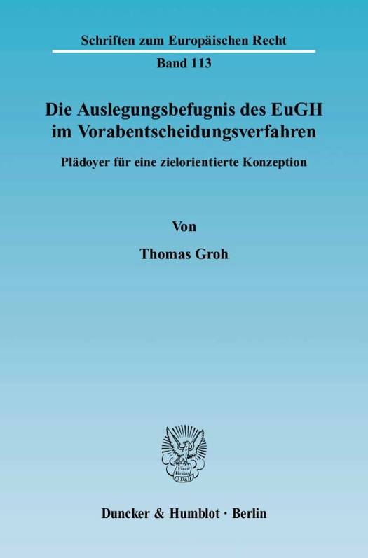 Thomas Groh entwickelt in seiner Arbeit eine Alternative zu der herkömmlichen, auf der Dichotomie zwischen Auslegung und Anwendung basierenden Beschreibung der Auslegungsbefugnis des EuGH im Vorabentscheidungsverfahren. Den mit der Auslegung des Gemeinschaftsrechts im Vorabentscheidungsverfahren verfolgten Zielen stellt er gemeinschaftsrechtliche Vorgaben gegenüber, die gegen eine Vorlage an den EuGH sprechen. Soweit den Zielen dabei größeres Gewicht zukommt, ist ein gemeinschaftsrechtliches Auslegungsbedürfnis anzuerkennen, das Grund und Grenze der Auslegungsbefugnis des EuGH im Vorabentscheidungsverfahren ist.