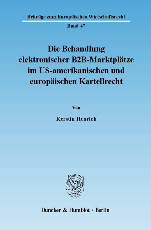 Dargestellt werden die Auswirkungen von B2B-Marktplätzen auf die Markttransparenz, die Bündelung von Einkaufsmacht durch Plattformnutzer und die Problematik der Verweigerung des Zugangs zu elektronischen Marktplätzen sowie der Zugangsgewährung zu diskriminierenden Bedingungen. Im Rahmen dieser Themen werden aktuelle Probleme des US-amerikanischen antitrust law sowie des europäischen Kartellrechts, wie die Rabattgewährung durch marktbeherrschende Unternehmen, näher beleuchtet.