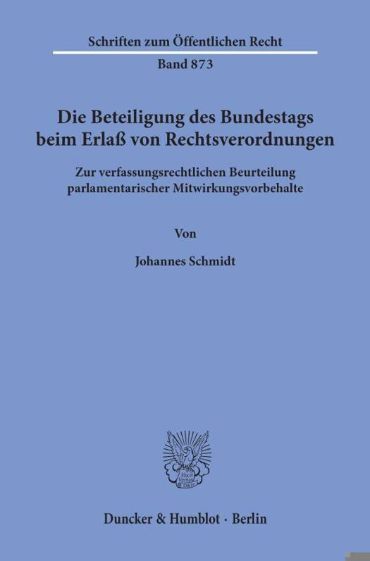 Johannes Schmidt arbeitet zunächst die Beteiligung des Bundestags beim Erlaß von Rechtsverordnungen als staatsrechtliches Problem heraus, bestimmt anschließend die verfassungsrechtlichen Direktiven für die Delegation von Rechtsetzungsbefugnissen, bereitet die einzelnen Beteiligungsformen beim Erlaß von Rechtsverordnungen auf, führt die Mitwirkungsvorbehalte zugunsten des Bundestags einer verfassungsrechtlichen Beurteilung zu und untersucht dabei insbesondere die für die Rechtfertigung dieser Vorbehalte zentrale Kompensationsthese.
