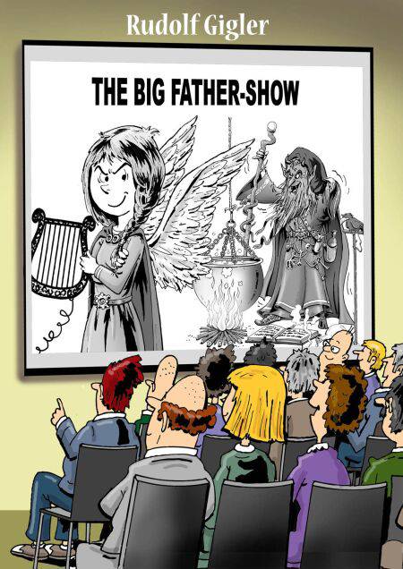 Zwei Familien, wie sie unterschiedlicher nicht sein könnten – die eine liebt Harfenmusik, Götterspeise und Weihrauch, die andere Dreck, Beelzebub-Suppe und Schwefelgestank. Die eine kommt aus dem Himmel, die andere aus der Hölle. Doch für eine Weile müssen sie unter einem Dach leben, in einem Container, wo sie – einer Eingebung eines Fernsehregisseurs folgend – Teil der einzigartigen Reality-Show "Big Father" sind. Und noch etwas haben die zwei grundverschiedenen Familien gemeinsam: Ärger mit dem Nachwuchs. Die Tochter der Himmelhochs benimmt sich keineswegs engelhaft, würgt die E-Harfe und hätte gerne eine Gel-Mähne statt Engelslocken. Auch der Sohn der Schwarzfells schlägt aus der Art, wäscht sich oft, bohrt nie in der Nase und leidet unter einer Schwefelstaub-Allergie. Die Nähe zwischen den beiden Familien bringt natürlich Probleme mit sich. Vor allem die beiden Herren können sich absolut nicht ausstehen und versuchen, einander das Leben mit kleinen Gemeinheiten schwer zu machen. Als sich auch noch die Tochter der Engelsfamilie und der Sohn der Teufelsfamilie verlieben, wird es turbulent in der Reality-Show "Big Father" ...