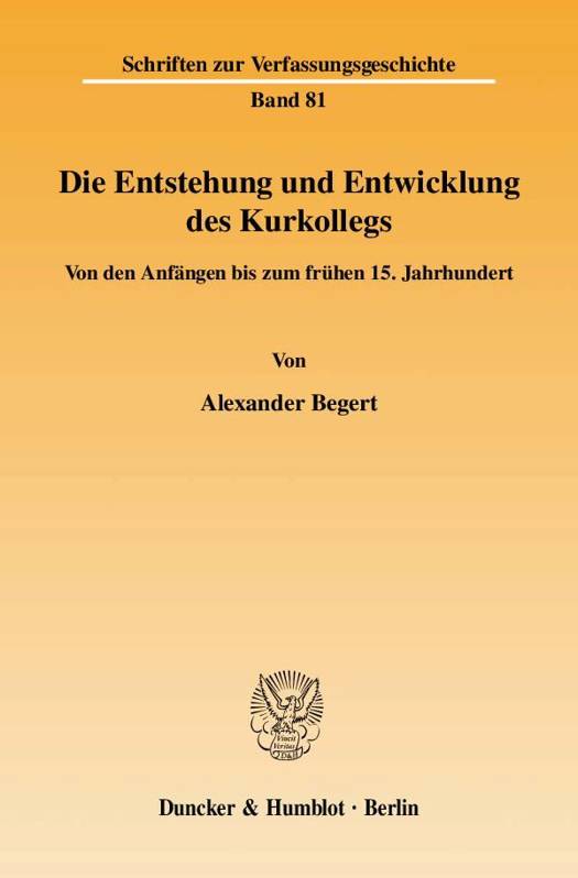 Das Buch behandelt das "Fundamentalrätsel der deutschen Verfassungsgeschichte", die Frage, wie sich im 13. Jhd. das Recht zur Wahl des römisch-deutschen Königs von allen Reichsfürsten auf die sieben so genannten Kurfürsten reduzieren konnte. Aufgrund der Prüfung sämtlicher Quellen und unter Berücksichtigung der rechtshistorischen Gegebenheiten sowie der politischen Verhältnisse des 13. Jhd.s gelangt Alexander Begert zu einem ebenso eindeutigen wie überzeugenden Ergebnis: Zunächst wurde in Analogie zu Schiedsgerichten ein Gremium von zeremoniell hervorgehobenen Hauptwählern geschaffen. Die Wahlrechtsreduktion erfolgte dann durch einen Rechtsakt im Jahre 1252. Grund hierfür war nicht zuletzt das Bemühen um eine Vereinfachung der Wahl und eine Gewährleistung ihrer Eindeutigkeit in unruhigen Zeiten. Darüber hinaus untersucht der Autor noch die weitere Ausformung des Kurkollegs, das Erbrecht bzgl. der Kur und das Majoritätsprinzip als solches.