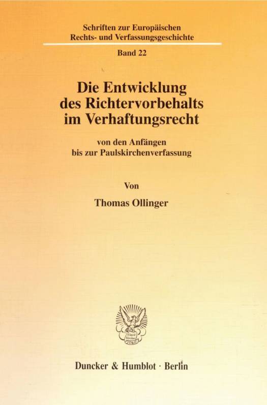 Die Arbeit beschreibt die historische Entwicklung des Richtervorbehalts im Verhaftungsrecht. Unter einem Richtervorbehalt versteht man das Erfordernis obligatorischer vorgängiger richterlicher Entscheidung über die Zulässigkeit von Verhaftungen. Es wird versucht nachzuweisen, daß die Wurzeln des Richtervorbehalts nicht in der englischen Habeas-Corpus-Akte von 1679 zu suchen sind, sondern viel weiter zurückreichen.