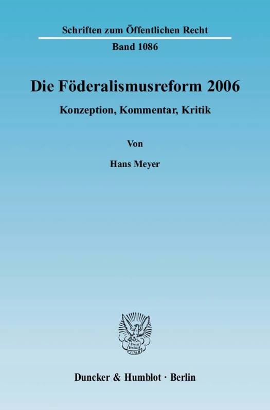 Hans Meyer legt neben den Reformzielen die Genese der Reform dar, an welcher er als Sachverständiger sowohl formell als auch informell intensiv beteiligt war, und analysiert die Wirkung des eingeschlagenen Verfahrens auf die Ergebnisse. Der umfangreiche Hauptteil enthält eine eingehende Kommentierung aller Grundgesetzänderungen, wobei die Entstehungsgeschichte wichtige Aufschlüsse zur Auslegung mancher Kompromisse zu geben vermag. Darüber hinaus werden die ersten selbstkritischen Äußerungen des Bundesverfassungsgerichts zu der seit 1958 vertretenen »Einheitsthese« aufgenommen, die einen nicht unwesentlichen Anteil an der übermäßigen Politikverflechtung hat, und auch für die Steuergesetze Wege der Überwindung aufgezeigt.