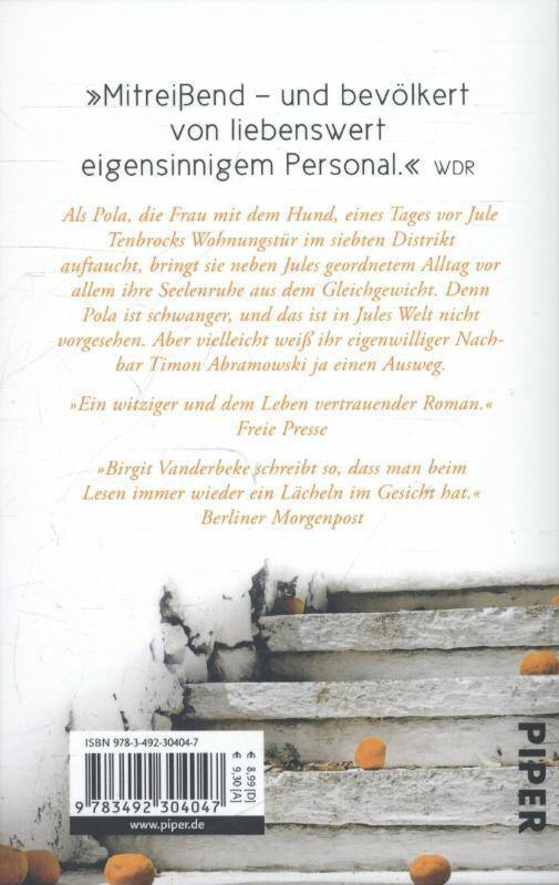 'Mitreißend - und bevölkert von liebenswert eigensinnigem Personal.' WDR Als Pola, die Frau mit dem Hund, eines Tages vor Jule Tenbrocks Wohnungstür im siebten Distrikt auftaucht, bringt sie neben Jules geordnetem Alltag vor allem ihre Seelenruhe aus dem Gleichgewicht. Denn Pola ist schwanger, und das ist in Jules Welt nicht vorgesehen. Aber vielleicht weiß ihr eigenwilliger Nachbar Timon Abramowski ja einen Ausweg. 'Ein witziger und dem Leben vertrauender Roman.' Freie Presse 'Birgit Vanderbeke schreibt so, dass man beim Lesen immer wieder ein Lächeln im Gesicht hat.'Berliner Morgenpost