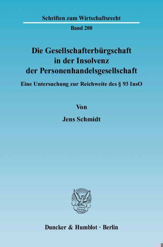 Die Regelung des 93 InsO soll verhindern, dass sich ein Gläubiger der dort genannten Gesellschaften in deren Insolvenz Vorteile dadurch verschafft, dass er vor anderen Gläubigern auf zusätzlich haftendes Gesellschaftervermögen zugreift. Jens Schmidt untersucht, ob diese Regelung zu der beabsichtigten Ausweitung der par condicio creditorum geführt hat und kommt zu dem Ergebnis, dass ein Zugriff auf das Gesellschaftervermögen auch nach Schaffung des 93 InsO weiter möglich ist. Verhindert wird nur die Durchsetzung der gesetzlichen Gesellschafterhaftung. Persönliche Schuldverpflichtungen des Gesellschafters (Bürgschaft, Garantie, Schuldbeitritt) berechtigen hingegen weiter zum Zugriff auf das Gesellschaftervermögen.