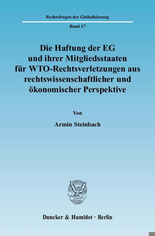 Können Unternehmen, die von durch die Welthandelsorganisation (WTO) genehmigten Strafzöllen betroffen sind, den entstandenen Schaden gegen die EG und ihre Mitgliedsstaaten einklagen? Zur Beantwortung dieser Frage unternimmt Armin Steinbach einen Vergleich europäischer nationaler Staatshaftungsvorschriften, analysiert das EG-Staatshaftungsregime auf Grundlage der Francovich-Rechtsprechung, befasst sich mit der Wesensverschiedenheit von Nichtigkeits- und Schadensersatzklage und untersucht inwiefern die Nichtbefolgung von Entscheidungen des WTO-Streitbeilegungsorgans einen geeigneten Haftungsgrund darstellt. Komplementär dient eine ökonomische Analyse dazu, die gegenwärtige Rechtsprechung des Europäischen Gerichtshofs auf ihre wirtschaftliche Effizienz und Anreizwirkungen zu untersuchen. Der Autor kommt zu dem Ergebnis, dass eine Haftung aus rechtlicher Sicht möglich und aus wirtschaftswissenschaftlicher Sicht wünschenswert ist.