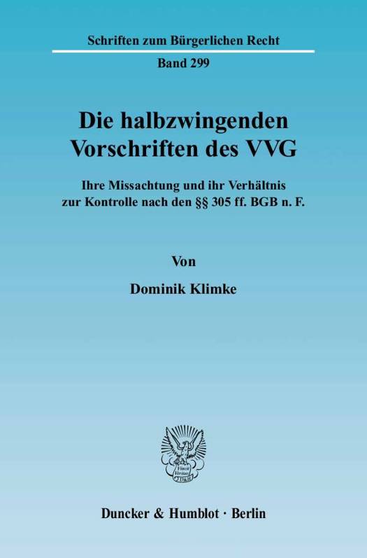305 ff. BGB zu berücksichtigen.Trotz ihrer großen praktischen Bedeutung sind die halbzwingenden Vorschriften in neuerer Zeit nicht Gegenstand einer systematischen Untersuchung gewesen. Diese Lücke schließt der Verfasser mit seiner Arbeit. Er entwickelt zunächst im ersten Teil allgemeine Grundsätze, wobei ein Schwerpunkt auf der Möglichkeit einer Saldierung von Vor- und Nachteilen liegt. Ferner arbeitet er Regeln für das Verhältnis der Kontrolle nach dem VVG zu den