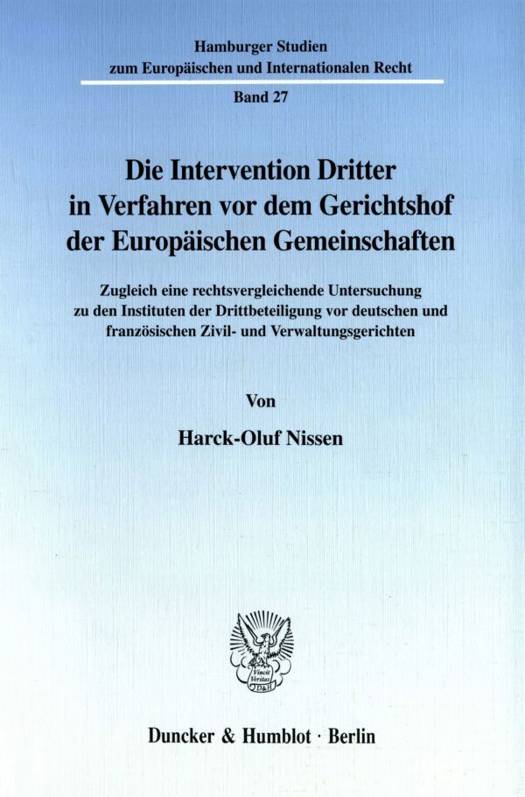 Der Autor betrachtet die Beteiligung Dritter an den Direktverfahren vor Gerichtshof und Gericht erster Instanz. In methodischer Hinsicht erfolgt die Untersuchung dabei durch eine vergleichende Betrachtung der gemeinschaftsrechtlichen Intervention mit den Formen der Drittbeteiligung im deutschen und französischen Zivil- und Verwaltungsprozeßrecht.Die Zulässigkeitsvoraussetzungen des Verfahrensbeitritts, die Inkenntnissetzung potentieller Streitgehilfen von Verfahrenseinleitungen und die Rechtsfolgen der Intervention erfahren allesamt eine eingehende Betrachtung. Zu ersteren zählen zunächst die Fragen, wem konkret Beteiligungsmöglichkeiten zustehen und inwieweit die Darlegung eines besonderen Interventionsinteresses im Einzelfall erforderlich ist. Ausführlich behandelt wird in diesem Zusammenhang zudem insbesondere Art. 37 Abs. 2 2. Hs. EG-Satzung, wonach andere Streithelfer als Mitgliedstaaten und Gemeinschaftsorgane in Streitigkeiten zwischen ebensolchen ausgeschlossen sein sollen. Der Autor zeigt auf, daß die Vorschrift in einem Konflikt mit dem grundrechtlichen Anspruch auf rechtliches Gehör steht und hinter diesen zurücktritt. Als unzureichend vor dem Hintergrund des Gehörsanspruchs erweist sich überdies die postiv-rechtliche Ausgestaltung der Informierung bestimmter Dritter von vor den Gemeinschaftsgerichten erhobenen Klagen. Harck-Oluf Nissen belegt, daß der Grundsatz des rechtlichen Gehörs vielmehr dazu zwingt, in gewissen Fällen eine ungeschriebene Verpflichtung zu einer individuellen Verfahrensbenachrichtigung anzunehmen. Bei den Rechtswirkungen der Intervention geht es zunächst um die Einordnung des Streitgehilfen in die personale Struktur des Prozesses als Partei oder als Dritter. Hiermit in engem Zusammenhang steht darauffolgend die Problematik möglicher aus der Prozeßbeteiligung entstehender Bindungswirkungen des Urteils für den Streithelfer. Wesentlicher Bestandteil der Rechtsfolgen der Intervention ist letztlich die Stellung des Streitgehilfen inne