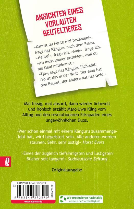 »Ich bin ein Känguru - und Marc-Uwe ist mein Mitbewohner und Chronist. Nur manches, was er über mich erzählt, stimmt. Zum Beispiel, dass ich mal beim Vietcong war. Das Allermeiste jedoch ist übertrieben, verdreht oder gelogen! Aber ich darf nicht meckern. Wir gehen zusammen essen und ins Kino, und ich muss nix bezahlen.« Mal bissig, mal verschroben, dann wieder liebevoll ironisch wird der Alltag eines ungewöhnlichen Duos beleuchtet. Völlig absurd und ein großer Lesespaß.