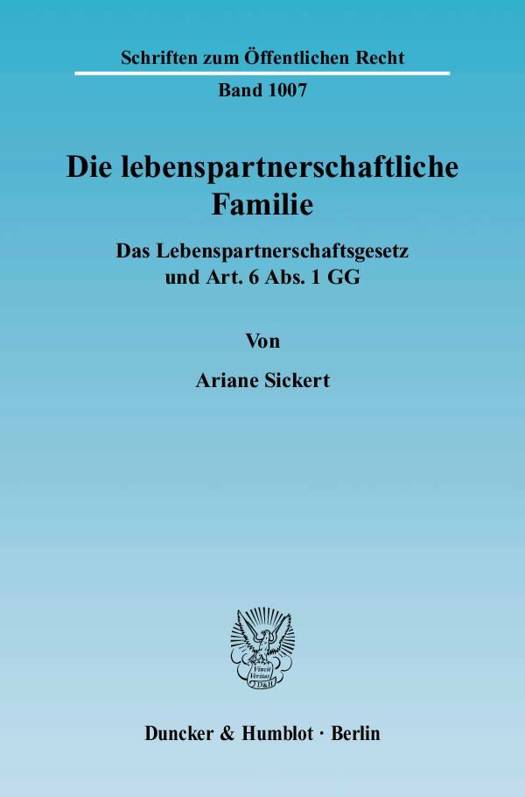 Ariane Sickert überführt die scheinbar antithetische Verbindung von Lebenspartnerschaften mit darin aufwachsenden Kindern in ein rechtlich synthetisches Konstrukt und untersucht die kindschaftsrechtlichen Wirkungen innerhalb einer Lebenspartnerschaft. Sie bejaht dessen verfassungsrechtlichen Familienschutz nach Art. 6 Abs. 1 GG und begründet eine durch das Kindeswohl legitimierte Erforderlichkeit gesetzlicher Veränderung. So gibt die lebenspartnerschaftliche Familie Impulse für Gesetz und Gesellschaft, wird vor allem aber als reale Familienform - getragen von Pluralität und Demokratie - bewusst.