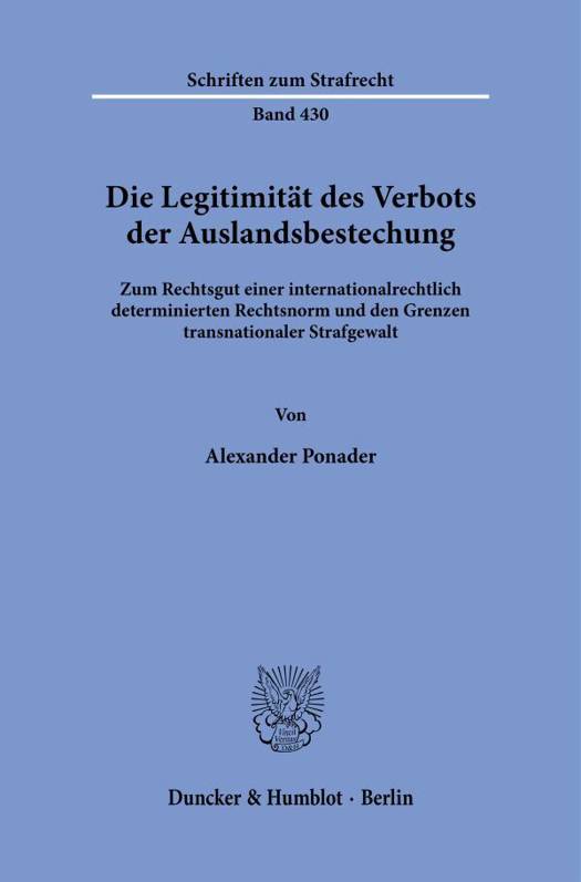 English summary: The Legitimacy of the Ban on Foreign Bribery. On the Value of a Legal Norm determined by International Law and the Limits of Transnational Criminal Jurisdiction The ban on foreign bribery in German criminal law is based on international anti-corruption conventions. It is far-reaching but does not follow a consistent approach. The author examines which interests the provision can be based on, including a human rights-based and a solidarity-based approach, and to what extent it is merely a symbolic legal norm based on international conventions. In addition to criminal law considerations, questions of state sovereignty are also examined and answered. German description: 335a StGB stellt auslandische Amtstrager deutschen Amtstragern fur die Tatbestande der Bestechung und Bestechlichkeit gleich - unabhangig von der Strafbarkeit nach auslandischem Recht. Die Vorschrift beruht auf internationalen Ubereinkommen, die jedoch zu undifferenziert im nationalen Recht umgesetzt wurden. Ausgehend von einer durch die Rechtsgutslehre modifizierten Verhaltnismassigkeitsprufung wird untersucht, ob und unter welchen Voraussetzungen sich die Vorschrift auf ein legitimes Schutzgut stutzen lasst. Insbesondere wird das Verhaltnis von Korruption und Menschenrechtsverletzungen erortert. Daruber hinaus wird die staatensouveranitatsbezogene Dimension der Strafgewaltserstreckung mit ihren Auswirkungen auf die materielle Strafnorm geklart. Am Ende steht das Ergebnis, dass es sich bei Auslandsbestechung um kein nach dem Weltrechtsprinzip verfolgbares Delikt handelt. Naheliegend ware eine Strafbarkeit zum Schutz auslandischer Verwaltungen. Hierfur musste der Schutz aber einem Stellvertretungsgedanken folgen.