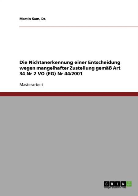Masterarbeit aus dem Jahr 2003 im Fachbereich Jura - Andere Rechtssysteme, Rechtsvergleichung, Note: genügend, Donau-Universität Krems - Universität für Weiterbildung (Abteilung für Europäische Integration), Sprache: Deutsch, Abstract: Nach klassischem Völkerrecht ist kein Staat verpflichtet ausländische Entscheidungen anzuerkennen. Um die Anerkennung von gerichtlichen Entscheidungen der Mitgliedsstaaten der europäischen Union uneingeschränkt zu gewährleisten, wurden entsprechende Regeln hiefür zuerst im EuGVÜ und nunmehr in der EuGVVO normiert. Nach Art 33 Abs 1 EuGVVO werden die in einem Mitgleidstaat ergagenen Entscheidungen in den anderen Mitgliedstaaten anerkannt, ohne dass es hiefür eines besonderen Verfahrens bedarf. Nur in bestimmten Fällen wird eine Entscheidung, die von ihrer Art her anerkennungsfähig wäre, nicht anerkannt, weil sie an einem Mangel leidet; dies Mängel sind in Art 34 und Art 35 Abs 1 EuGVVO abschließend aufgezählt. Ziel des gegenständlichen Buches ist die Darstellung der Anerkennungsversagung einer Entscheidung wegen Verletzung des rechtlichen Gehörs des Verfahrensgegeners aufgrund mangelhafter Zustellung an diesen.