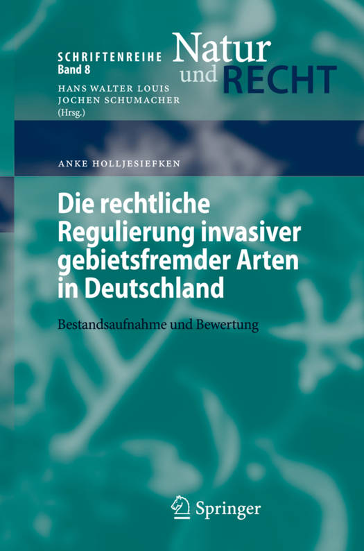 Die rechtliche Regulierung des Problems invasiver gebietsfremder Arten in Deutschland. Teil 1: begriffliche und rechtstatsächliche Grundlagen. Teil 2: Analyse und Bewertung der völker-, europa- und nationalen umweltrechtlichen Vorschriften. Hier stellt die Autorin erhebliche Defizite fest: mangelhafte Umsetzung und Koordination, fehlende Konkretisierung. Ein Handlungsbedarf, auf den die Autorin mit konkreten Regelungsvorschlägen reagiert.