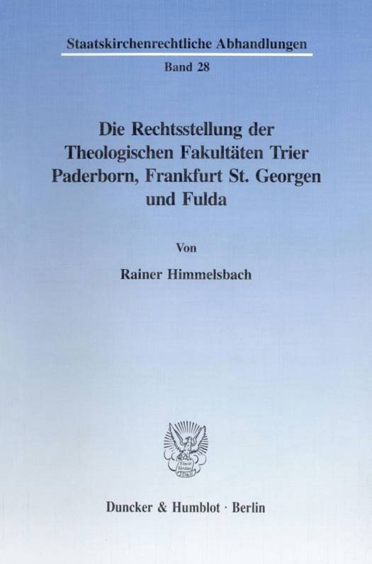 Das Zusammenwirken von Staat und Kirche bei Errichtung und Betrieb katholisch-theologischer Fachbereiche wurde schon des öfteren untersucht. Dagegen blieb der staatskirchenrechtliche Status und die damit korrespondierende hochschul- und kirchenrechtliche Stellung der Theologischen Fakultäten weitgehend unerforscht. Die vorliegende Untersuchung zeigt nunmehr, daß Errichtung, Wissenschaftsbetrieb und Organisation Theologischer Fakultäten als eigene Angelegenheiten der Kirche vom verfassungsmäßigen Selbstverwaltungsrecht der Kirche geschützt sind.