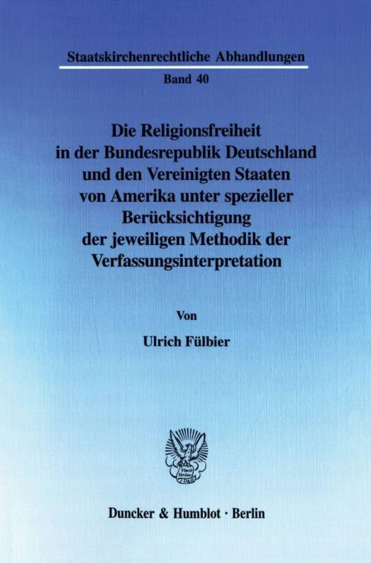 Ulrich Fülbier widerlegt diese herkömmlichen Vorstellungen und weist nach, daß sich die staatskirchenrechtlichen Systeme beider Staaten mittlerweile weitgehend angenähert haben. Der Autor zeigt auf, daß durch die jüngsten Urteile des amerikanischen Höchstgerichts, des U.S. Supreme Court, der Schutz der Religionsfreiheit in Deutschland mittlerweile sogar deutlich weiter geht als in den USA. Seiner umfassenden Untersuchung liegt eine Analyse der Auslegungsmethoden zugrunde, die in Deutschland und den USA zur Interpretation der Verfassungsnormen herangezogen werden.