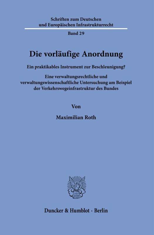 English summary: The Provisional Order. A Practicable Instrument for Acceleration? An Administrative Law and Administrative Science Study Using the Example of Federal Transport Infrastructure With the provisional order, the possibility of an early start of construction was transferred with great expectations from the Federal Waterways Act to the Federal Trunk Roads Act and the General Railway Act. The paper analyses the instrument from the perspective of administrative law and administrative science. De lege lata, some of the standards are not practicable. Possibilities and limitations are identified and an attempt is made to make the instrument de lege ferenda more practicable for users by proposing a standard. German description: Die Moglichkeit des vorzeitigen Baubeginns wahrend eines laufenden Planfeststellungsverfahrens ist - als vorlaufige Anordnung - Ende 2018 mit grossen Erwartungen aus dem Bundeswasserstrassengesetz in das Bundesfernstrassen- und das Allgemeine Eisenbahngesetz uberfuhrt worden. Die Arbeit untersucht das Instrument verwaltungsrechtlich und verwaltungswissenschaftlich. Nach einer Einordnung in die Beschleunigungsgesetzgebung zeigt sich, dass volker-, unions- und verfassungsrechtliche Vorgaben die Auslegung beeinflussen. Ein Normenvergleich lasst Unterschiede und komplexe Anwendungs- und Auslegungsfragen deutlich werden, die sich mit guter Rechtsetzung nicht in Einklang bringen lassen. Die aus der verwaltungswissenschaftlichen, empirischen Behordenbefragung gewonnenen Erkenntnisse lassen sich zu Chancen und Grenzen der vorlaufigen Anordnung zusammentragen, aus denen ein Normvorschlag in Gestalt eines 73a VwVfG resultiert, um das Instrument fur die Anwendungspraxis praktikabler auszugestalten.