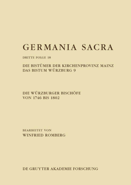 Der vorliegende Band der Würzburger Bischofsreihe der Germania Sacra behandelt die letzten fünf Pontifikate des fränkischen Hochstifts von 1746 bis zur Aufhebung des geistlichen Staatswesens 1802. Damit ist die Series Episcoporum während des Alten Reiches insgesamt abgeschlossen. Diese Epoche ist gekennzeichnet vom allmählichen Übergang des Spätkonfessionalismus zur Aufklärung. Deren Blütezeit ab den 1760er bis in die frühen 1790er Jahre verkörpern die hervorstechenden Regierungen Adam Friedrichs von Seinsheim (1755-1779) und Franz Ludwigs von Erthal (1779-1795): Beide betrieben eine intensive Reformpolitik, vor allem im religiösen Bereich, in Schulwesen, Sozialpolitik sowie in Straßen- und allgemeinem Landesausbau. Daher gilt Würzburg in der Forschung bis heute als einer der markantesten Vorreiter der Aufklärung im damaligen katholischen Deutschland. Freilich zeigten sich neben den Fortschritten und Erfolgen zugleich Systemgrenzen, Diskursverschiebungen, Brüche und Widersprüchlichkeiten solcher Modernisierungsstrategien. Zu einer Drosselung dieses Reformkurses führten ereignisgeschichtlich jedoch die politischen Umschwünge im Gefolge der Französischen Revolution seit 1789 samt der einhergehenden Kriege gegen sie. Angesichts des unabwendbar näher rückenden Säkularisationsszenarios gingen von Würzburg noch bis zuletzt, wenn auch erfolglos, diplomatische Verhinderungsinitiativen aus. Mit Eintritt der Säkularisation 1802, die auf nahezu allen Ebenen von Gemein- und Kirchenwesen in den nächsten Folgejahren durchgeführt wurde, war die über 1000-jährige Tradition Würzburger Eigenstaatlichkeit unwiderruflich zu Ende.