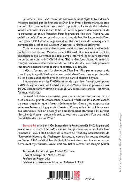 Le samedi 8 mai 1954, l'avion de commandement capte le tout dernier message expedie par les Francais de Dien Bien Phu: Sortie manquee stop ne puis plus communiquer avec vous stop et fin. La sortie d' Isabelle vient d'echouer et c'est bien la fin. La fin de la guerre d'Indochine et de la puissance coloniale francaise. Pour la premiere fois dans l'histoire, une guerilla a defait l'un des grands sur un champ de bataille. La perte de Dien Bien Phu en 1954, dont le siege aura dure 167 jours, aura des consequences comparables a celles qui suivirent Waterloo, la Marne et Stalingrad. Comment en est-on arrive a cette situation desesperee a la veille de la conference de Geneve ? Minutieusement, Bernard Fall, apres avoir recueilli les temoignages des survivants des deux camps, interroge les acteurs essentiels de ce drame comme Ho Chi Minh et Giap a Hanoi, et obtenu du ministre francais des armees l'autorisation de consulter des documents de premiere importance encore tenus secrets, reconstitue la bataille. Il decrit l'assaut puis l'asphyxie de Dien Bien Phu par une guerre de tranchee qui rappelle Verdun, et nous conduit dans l'enfer du camp retranche ou les blesses sont terres avec la vermine dans d'obscurs boyaux. Il montre comment les 13 000 hommes de la garnison francaise, composee a 70 % de legionnaires, de Nord-Africains et de Vietnamiens, s'opposerent aux 50 000 combattants Vietminh et aux 55 000 requis sans armes - hommes, femmes, vieillards. Bernard Fall, dans ce magistral panorama que lui seul pouvait ecrire avec une aussi grande competence, devoile la verite sur les aspects caches de cette tragedie: quels furent reellement les roles et les rapports des generaux Navarre, Cogny et de Castries ? Pourquoi les Etats-Unis ne sont pas intervenus ? A-t-on envisage un bombardement atomique ? Et, surtout, l'histoire du Vietnam aurait-elle pris sa tournure actuelle si l'on avait evite une defaite decisive en 1954 ?