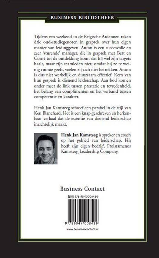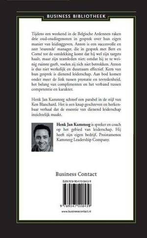 Tijdens een weekend in de Belgische Ardennen raken drie oud-studiegenoten in gesprek over hun eigen manier van leidinggeven. Anton is een succesvolle en zeer sturende manager die in gesprek met Bert en Corné tot de ontdekking komt dat hij weliswaar zijn targets haalt, maar zijn teamleden erg weinig ruimte geeft, waardoor zij zich niet betrokken voelen. Anton is dus niet werkelijk en duurzaam effectief. Hoe kan het dan wel? Kern van hun gesprek is dienend leiderschap. Aan bod komen onder meer de link tussen prestatie en tevredenheid, het belang van complimenten en het verband tussen competentie en karakter.