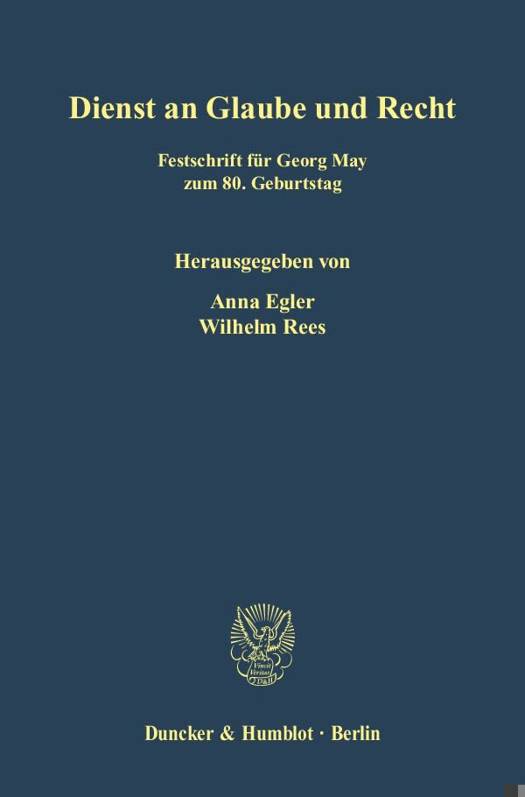 Die Festschrift Dienst an Glaube und Recht ist dem emeritierten Mainzer Kirchenrechtler Georg May zur Vollendung seines 80. Lebensjahres am 14. September 2006 gewidmet. Der Titel umfasst wesentliche Inhalte von Leben und Schaffen des bekannten und in der Disziplin anerkannten Wissenschaftlers. Er impliziert das Grundanliegen des Jubilars, die Verklammerung von Glaube und Recht und ihre Verwiesenheit aufeinander in Theorie und Praxis. Denn der unermüdliche Dienst an Glaube und Recht sind Lebens- und Arbeitsprogramm des Gelehrten und Priesters Georg May. Kollegen und Freunde des In-und Auslandes haben diese Festschrift mit ihren 32 Beiträgen gestaltet. Nicht nur Vertreter der kanonistischen Disziplin, sondern auch der Dogmatik, der Moraltheologie, der Kirchen- und Profanhistorie sowie der Rechtswissenschaft haben ihre Forschungsergebnisse beigesteuert. Manche Autoren knüpfen mit ihren Darlegungen an Publikationen des Jubilars an, diskutieren diese oder verweisen für ein bestimmtes Problem auf eine weiterführende Veröffentlichung Mays. So spiegelt der Inhalt der Festschrift in gewissem Sinne das wissenschaftliche Werk des zu Ehrenden wider. Die Vielfalt der in dieser Festgabe vereinigten Beiträge aus unterschiedlichen Fachrichtungen und der behandelten, mitunter aktuellen brisanten Fragen sind von besonderer Bedeutung für die Wissenschaft wie für die Glaubenspraxis.