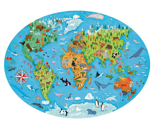 De wereld verandert, en daarmee... de wezens die er leven! Maak de puzzel en ontdek welke dieren op de verschillende continenten leven. Check het boek voor meer informatie over al die soorten, en welke er gevaar lopen uit te sterven. Ga mee op een spannende wereldreis en leer alles over dieren. Maak de ovale puzzel met wel 200 stukjes en lees over dieren in het bijbehorende boekje. De puzzel komt in een mooie stevige doos met hengsel om overal mee naartoe te nemen. Reis, leer en onderzoek!
