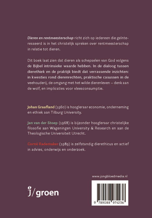 • Volledig vernieuwde en herziene uitgave van En God schiep! • Rentmeesterschap; de verantwoordelijkheid van mensen ten opzichte van de schepping van God, specifiek: de dieren • Het boek laat zien dat dieren als schepselen van God volgens de Bijbel intrinsieke waarde hebben. • Wat er in de Bijbel staat, blijkt verrassend actueel in kwesties rond dierenrechten, praktische casussen in de veehouderij, het behoud van het wilde dierenleven (o.a. de wolf) en de implicaties voor vleesconsumptie.
