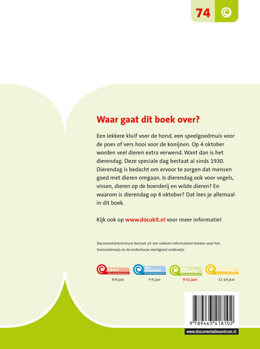 Een lekkere kluif voor de hond, een speelgoedmuis voor de poes of vers hooi voor de konijnen. Op 4 oktober worden veel dieren extra verwend. Want dan is het dierendag. Deze speciale dag bestaat al sinds 1930. Dierendag is bedacht om ervoor te zorgen dat mensen goed met dieren omgaan. Is dierendag ook voor vogels, vissen, dieren op de boerderij en wilde dieren? En waarom is dierendag op 4 oktober? Dat lees je allemaal in dit boek.